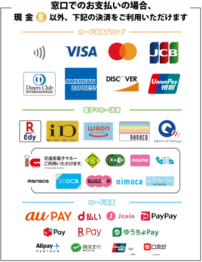 現金の他、クレジットカードや電子マネーもご利用いただけますが、当日のWi-Fi環境により決済にお時間をいただく場合もございますので、予めご了承ください。※チャージはできません。